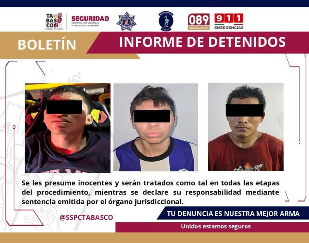 Los detenidos, quienes responden a los nombres de Darvin Uriel "N", Cristopher "N" y José Luis " N", fueron puestos a disposición de la autoridad competente, junto con los objetos asegurados, para iniciar las investigaciones correspondientes.