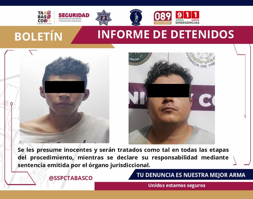 Como resultado del plan de contención del delito, los agentes detuvieron en el municipio de Centro, a los presuntos responsables, quienes responden a los nombres de Diego Abel "N" y Francisco Javier "N".