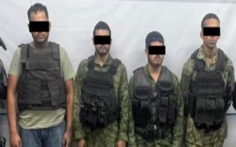 Metros adelante le dieron alcance a una camioneta Jeep, tipo Mojave, color gris, con placas de circulación de Chiapas, y lograron la detención de Mario "N", Jhovany "N", Carlos "N", y César "N", quienes estaban con vestimenta militar y chalecos antibalas.