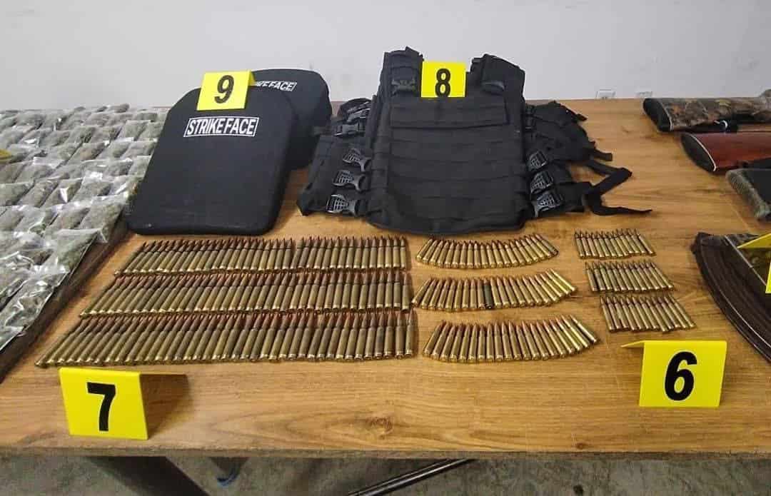 Les fue asegurado siete bolsas grandes y diversas dosis de hierba verde y seca con las características de la marihuana, cuatro armas largas, tres chalecos tácticos, cuatro gorras y diversos cartuchos de armas de fuego. Asimismo, se les decomisaron cuatro vehículos, todos con reporte de robo.