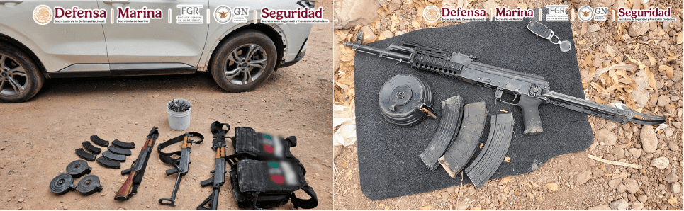- En seguimiento a los trabajos de investigación e inteligencia, en el estado de Sinaloa, elementos de la Secretaría de Seguridad y Protección Ciudadana (SSPC), Secretaría de la Defensa Nacional (Defensa), Secretaría de Marina (Semar), Fiscalía General de la República (FGR) y Guardia Nacional (GN), detuvieron a cuatro personas, entre ellas a dos menores de edad, a quienes les aseguraron armas de fuego, cargadores, equipo táctico, equipo telefónico y dos vehículos.