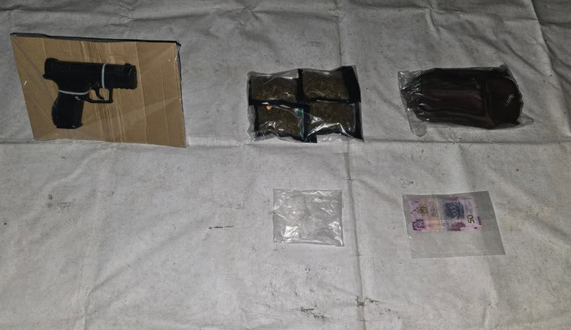 - Darwin Gadiel tras percatarse de los elementos policiales trató de darse a la fuga a pie, sin embargo, fue asegurado; portaba una mariconera en la que se le encontró 4 dosis de marihuana, 17 dosis de metanfetamina (Cristal), una pistola de color negro, calibre .5 milímetro (.177), fabricada en Taiwán y la suma de 150 pesos.