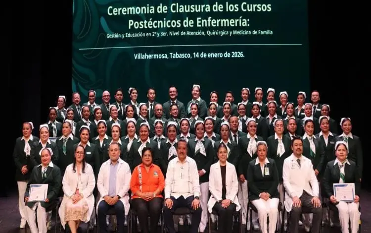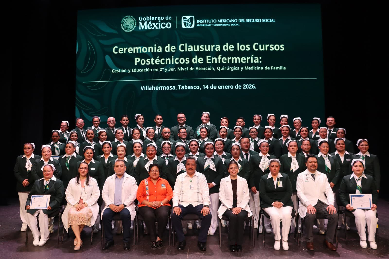 El IMSS en Tabasco celebró la clausura de los Cursos Postécnicos de Enfermería 2025, en los que 58 trabajadoras y trabajadores concluyeron su formación especializada en las áreas de Gestión y Educación en el Segundo Nivel de Atención, Medicina Familiar y Enfermería Quirúrgica.