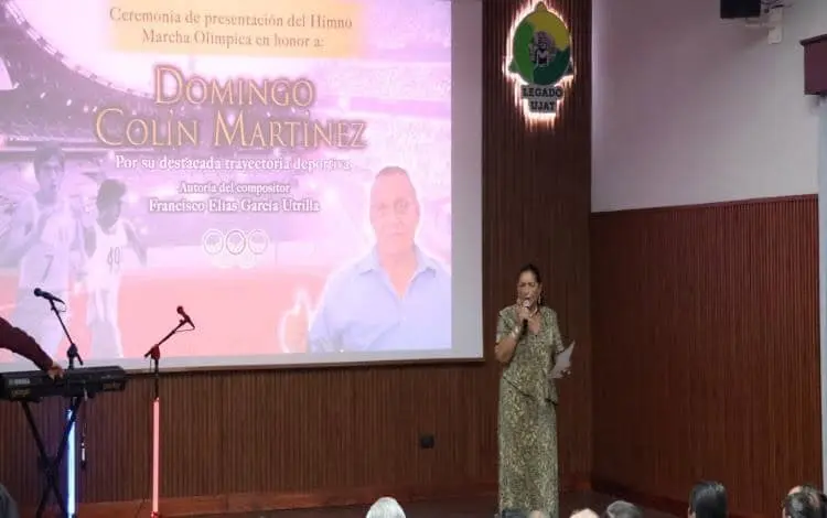 El reconocido deportista internacional estuvo acompañado de familiares y amigos en el auditorio Manuel Sánchez Mármol del Instituto Juárez, donde se hizo la presentación del himno “La Marcha Olímpica” dedicada a su destacada trayectoria en el atletismo.