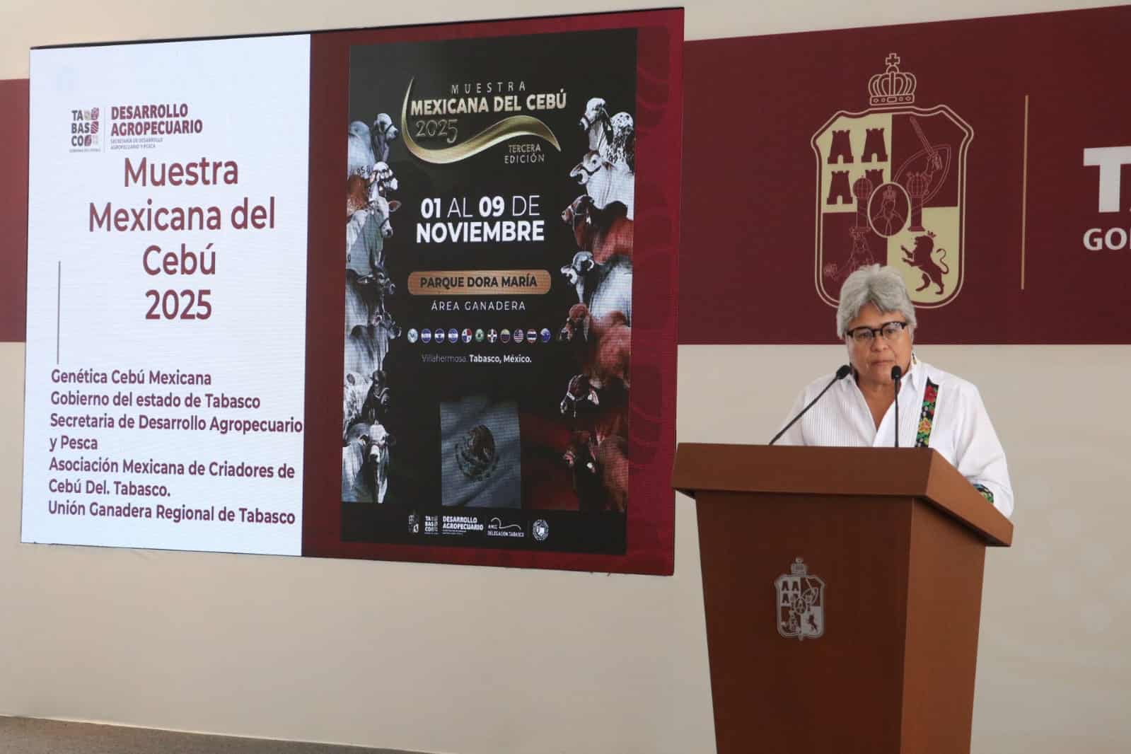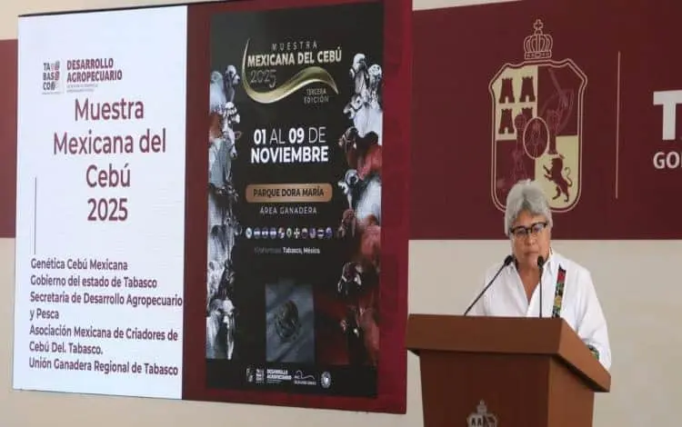 Luisa Cámara Cabrales, secretaria de Desarrollo Agropecuario y Pesca (Sedap) dio a conocer que la tercera edición de la Muestra Mexicana del Cebú 2025 reunirá a especialistas de 12 naciones, y se llevará a cabo del 1 al 9 de noviembre en el Parque Tabasco "Dora María".