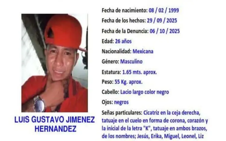 La tercera persona que se encuentra desaparecida se llama Luis Gustavo Jiménez Hernández, de 26 años de edad, mide 1.65 metros aproximadamente, pesa 55 kilogramos, es de cabello lacio largo color negro, tiene ojos negros.