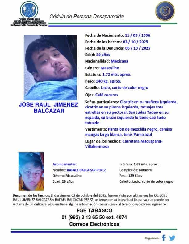 - Los hechos ocurrieron en distintas fechas y horas, las autoridades activaron los protocolos de búsqueda tras las denuncias interpuestas por los familiares quienes están angustiados y exigen que se investigue. José Raúl Jiménez Balcázar de 29 años de edad desapareció el tres de octubre, sin embargo, sus familiares denunciaron los hechos el pasado seis del mismo mes.