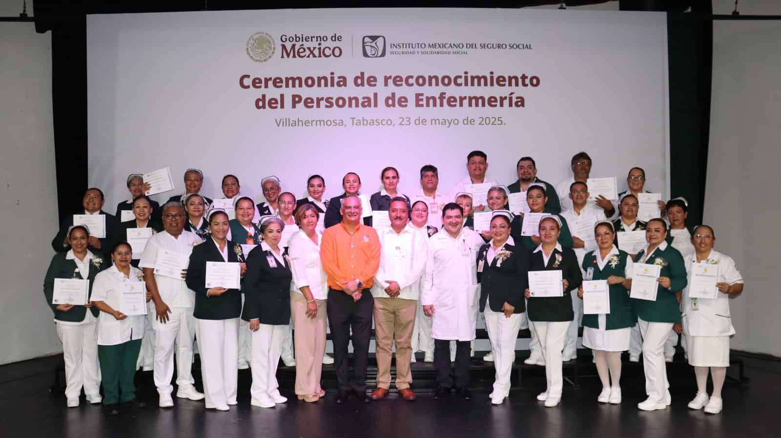 Durante la ceremonia de Reconocimiento al Personal de Enfermería, el Doctor Orgaz Fernández estuvo acompañado por la representante de la secretaría general del Sindicato Nacional de los Trabajadores del Seguro Social (SNTSS), sección XXVI Tabasco, doctora María Evelin Martínez Cortés, y por el secretario del Interior y Propaganda, Eliud Carrillo Balboa.