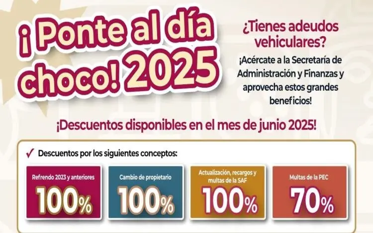 - En lo referente a las multas 2025 y años anteriores, levantadas por la PEC por violaciones al Reglamento de la Ley de Tránsito y Vialidad del Estado, éstas tendrán un 70% de descuento y aplicará tanto a ciudadanos morosos, esto es, a quienes deben algún refrendo, el cambio de propietario o que no han hecho el cambio de placas, como a ciudadanos cumplidos o que están al día.