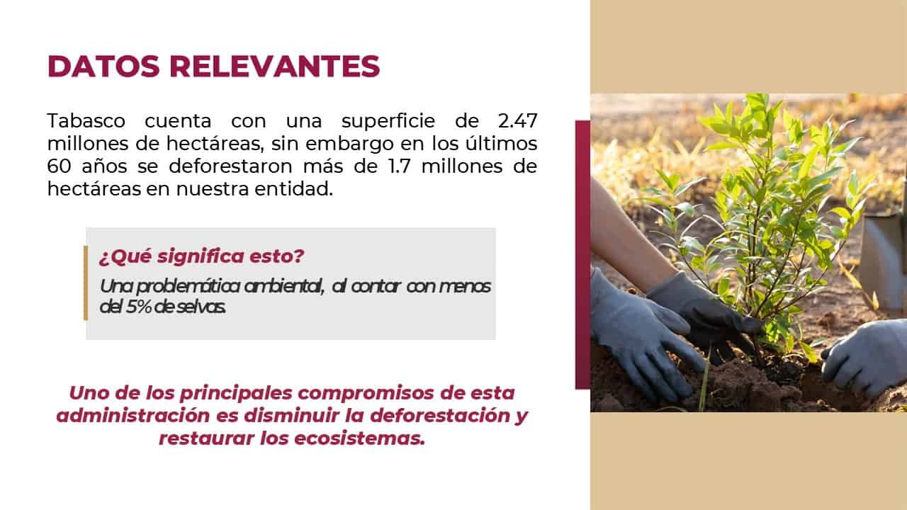 Señaló que Tabasco cuenta con una superficie de 2.47 millones de hectáreas, de las que ya se deforestaron esas 1.7 millones, por lo que cuenta con menos de 5 por ciento de selvas. "Pero uno de los principales compromisos del Gobierno del Pueblo es disminuir la deforestación y restaurar sus ecosistemas", puntualizó.
