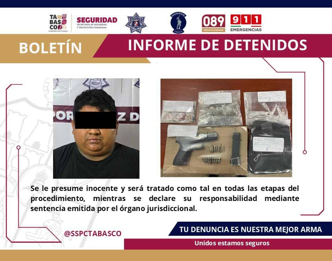 Elementos de la Fuerza Interinstitucional de Reacción Táctica (FIRT) Olmeca, detuvieron en flagrancia a un masculino en el municipio de Huimanguillo por su presunta responsabilidad en delitos contra la Ley General de Salud y la Ley Federal de Armas de Fuego y Explosivos.
