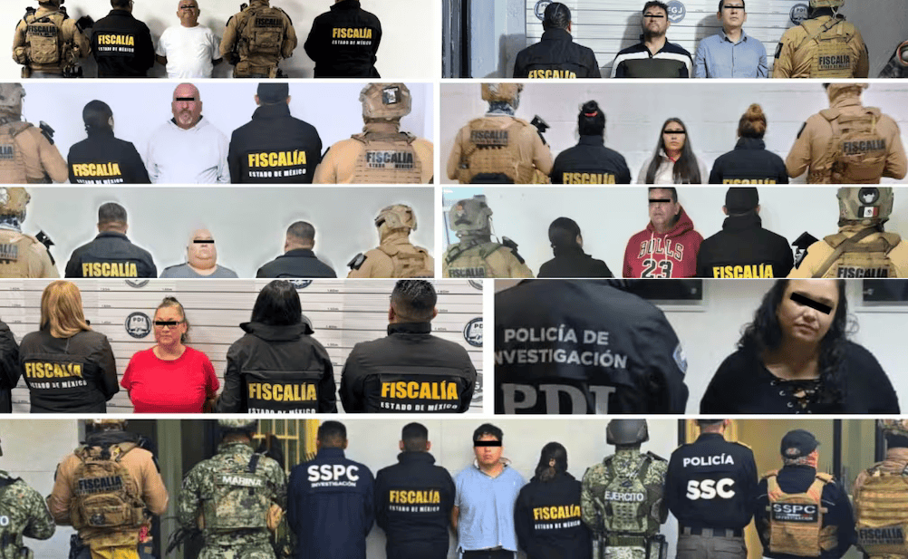 - La FGJEM detalló que se trata de tres notarios, cinco servidores públicos estatales, cuatro municipales y cumpliendo órdenes de aprehensión a 11 objetivos prioritarios integrantes de organizaciones sociales autodenominadas "sindicatos" que formaban parte de las redes criminales de despojos de propiedades en 14 municipios, principalmente en el Valle de México y la zona Oriente del Estado de México.