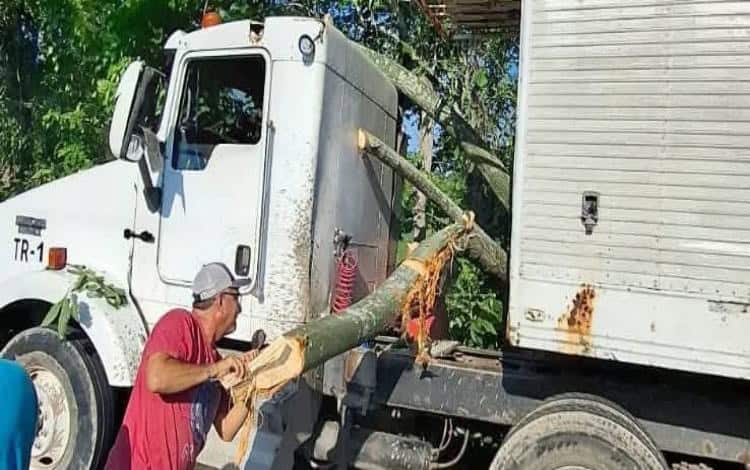 - Un tráiler, al circular por la vía, impactó un árbol, provocando que este se quebrara y quedara atrapado entre la cabina y la caja de la unidad.