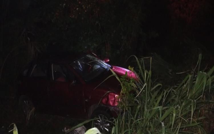 Pareja que circulaba en su vehículo particular sobre la carretera de la ranchería Montelargo primera sección, se accidentaron cerca del kilómetro 11 al tratar de esquivar a una persona que le salió al paso en un tramo oscuro; el conductor perdió el control hasta salirse de la carretera.
