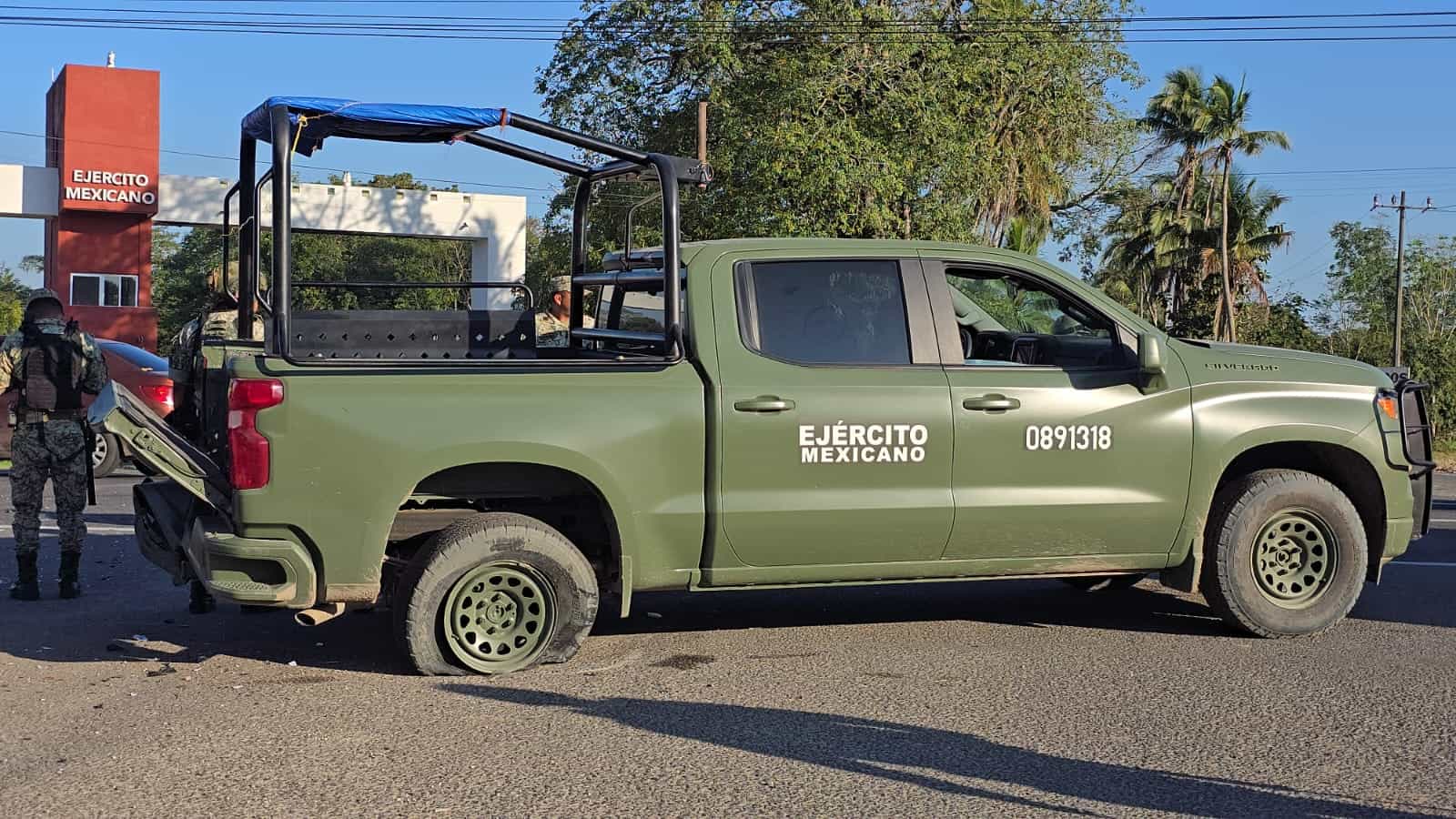 El conductor del auto trató de evitar la acción, sin embargo terminó golpeando la esquina de la camioneta, a la cual hizo que girara sobre su propio eje dejando como resultado que los 4 militares que viajaban en la batea salieran proyectados.