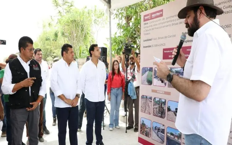 El Gobernador Javier May Rodríguez supervisó este sábado la obra de construcción de pavimento hidráulico, guarniciones y banquetas en el fraccionamiento Brisas del Carrizal del municipio de Nacajuca. En dicho lugar, donde se invierten 21.8 millones de pesos, también se efectúan obras complementarias y de alumbrado público en beneficio de 340 mil 60 habitantes.
