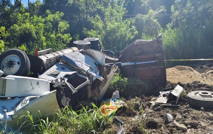 - Datos obtenidos por este medio informativo, precisan que el chofer de un tractocamión con una góndola cargada de material pétreo, presumiblemente perdió el control cuando bajaba y los frenos no le respondieron. La salida de la cinta asfáltica fue inevitable y el mastodonte terminó volcando, provocando que la cabina quedara destrozada y en el interior el conductor que quedó atrapado, con múltiples golpes y lesiones que colapsaron su cuerpo.