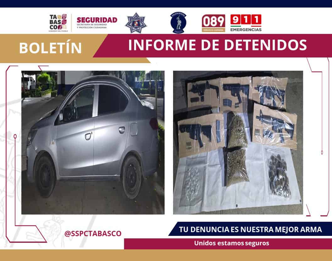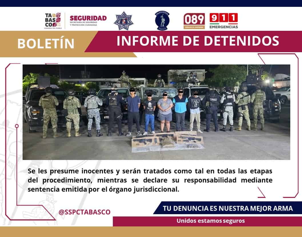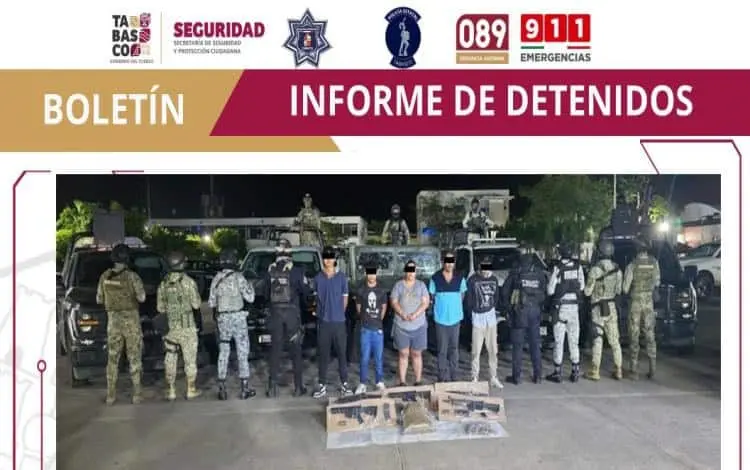 Como resultado de las estrategias de seguridad implementadas en Tabasco, la Secretaría de Seguridad y Protección Ciudadana, en coordinación con la Fuerza Interinstitucional de Reacción Táctica (FIRT) Olmeca, detuvo a cinco personas por presuntos delitos relacionados con la Ley General de Salud y por portación de arma de fuego.