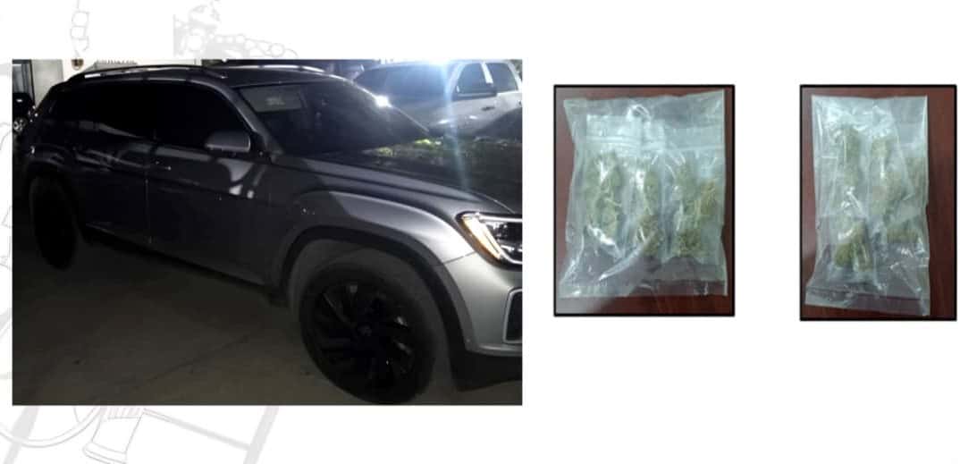 A los detenidos se les aseguró bolsitas transparentes que en su interior contenían hierba seca color verde con características similares a la marihuana y un vehículo Volkswagen Teramont de color gris al parecer con reporte de robo.