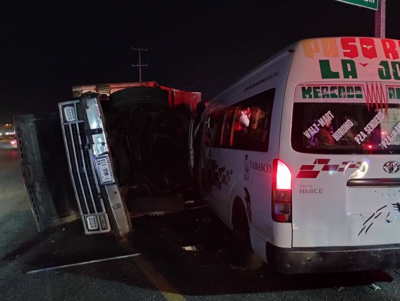 Aparatoso accidente se registró anoche en la carretera federal Frontera a Villahermosa, una Urban del servicio público fue impactada por una camioneta de tres toneladas, está última terminó volcada. Hubo una persona prensada.