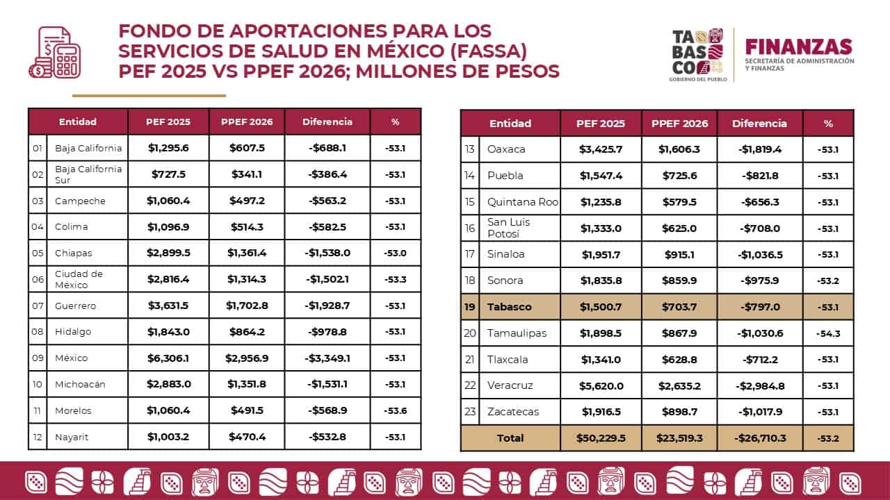 Dejó en claro que Tabasco no se verá afectado con la aparente disminución de recursos del Fondo de Aportaciones para Servicios de Salud (FASSA), contemplado en un 53.1%, pues se trata solo de una reorientación de recursos.