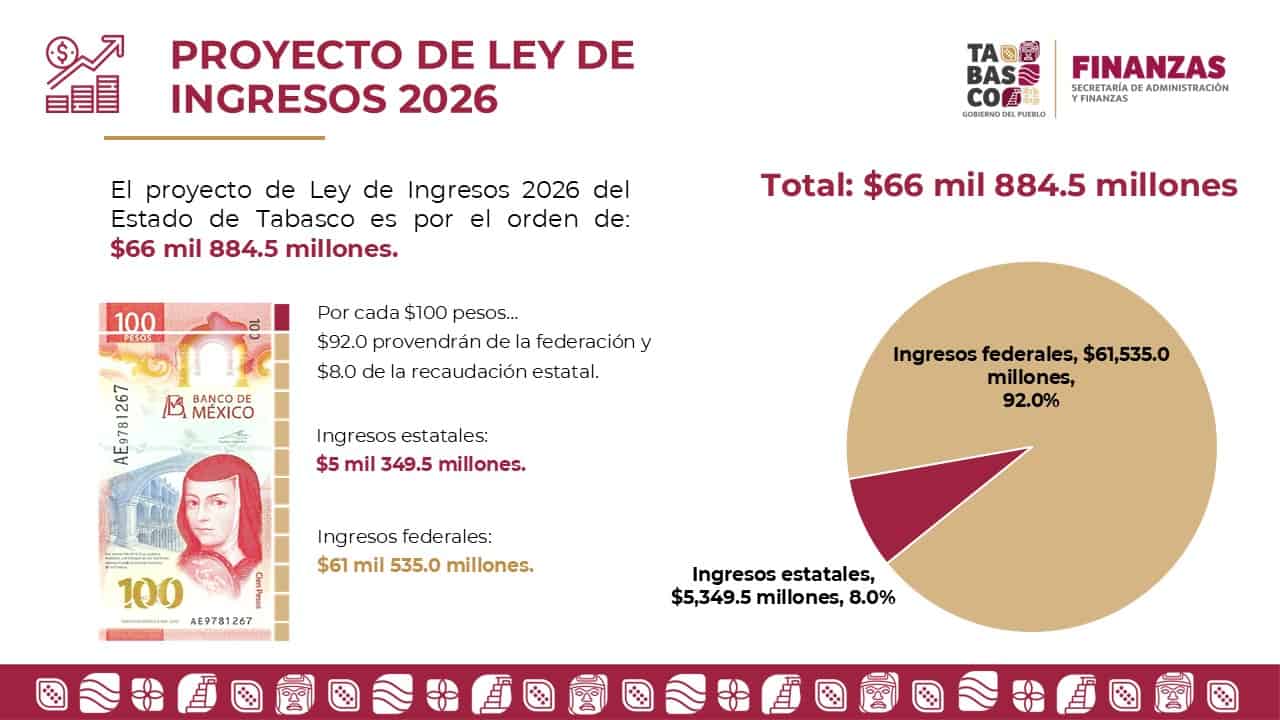 Explicó que, de forma general, el proyecto de Ley de Ingresos 2026 contempla 66 mil 884.5 millones de pesos, de los cuales estiman un 92% de ingresos federales y un 8% de ingresos estatales.