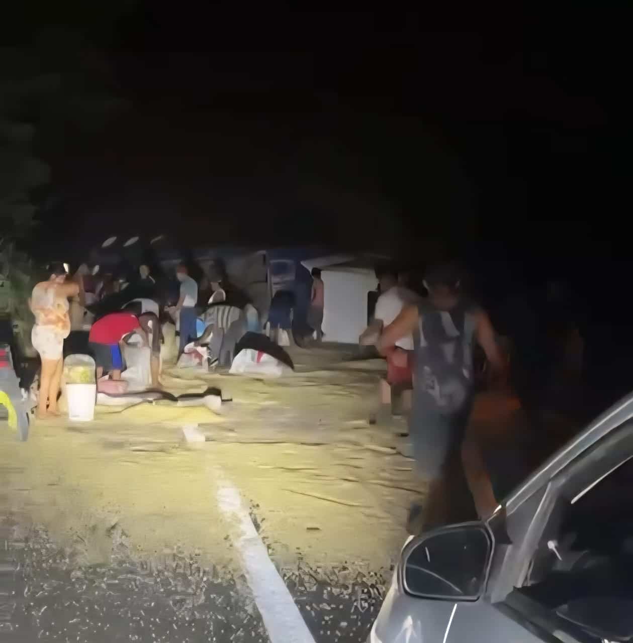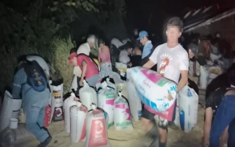 Comenzaron a rapiñar, con cubetas y costales comenzaron a saquear el camión de caja seca que estaba volcado, era una unidad con placas de la caja 67-AH-6H y de circulación 881-XP-2.