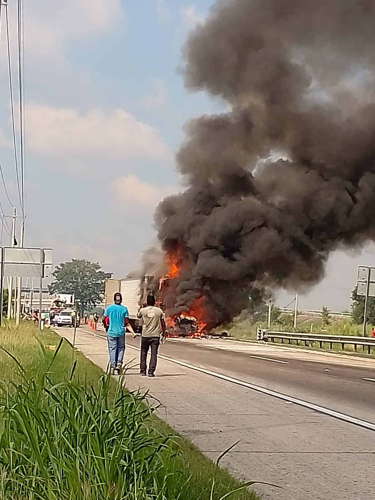 De acuerdo con los primeros reportes, el incidente inicial ocurrió cuando un tráiler que circulaba sobre la vía federal chocó contra otro vehículo pesado que salía de una "cachimba" ubicado en la zona.