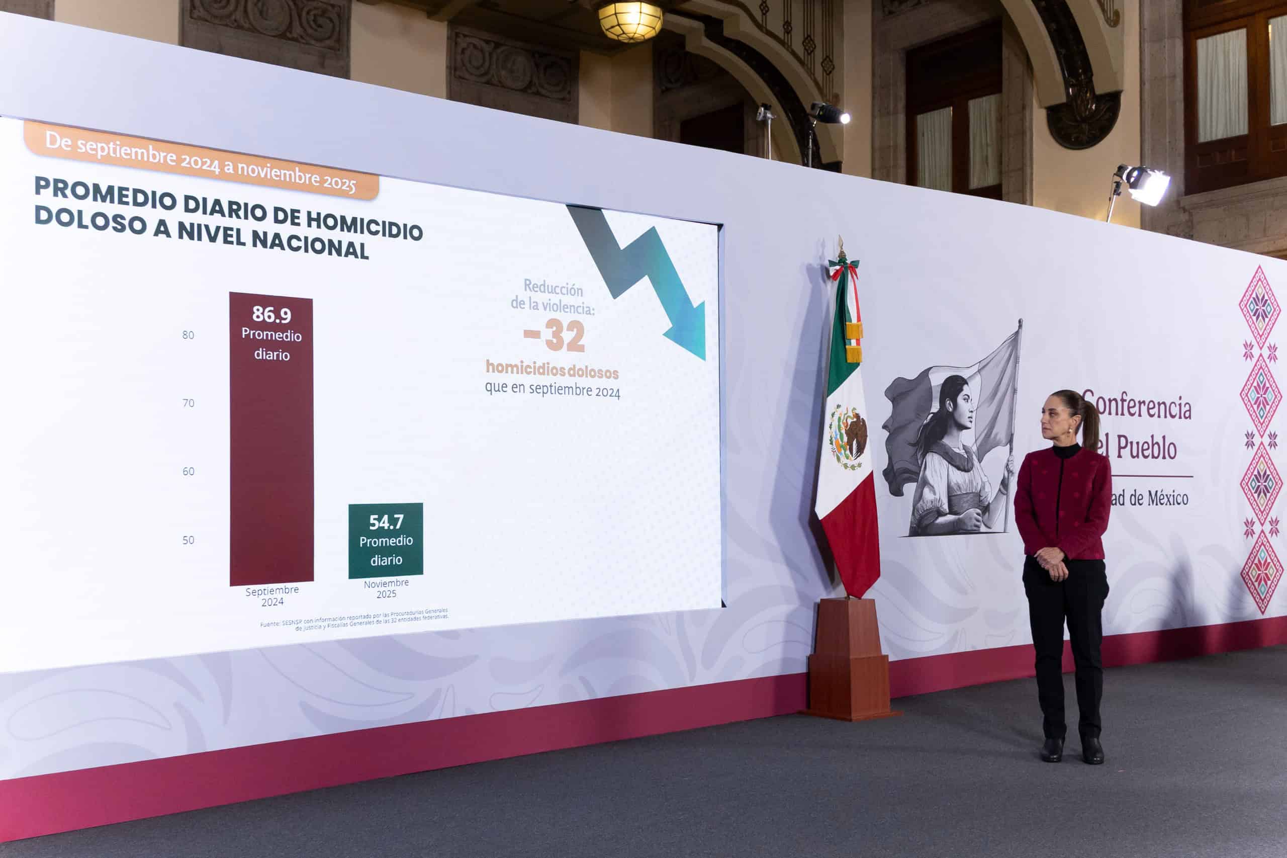 El promedio de homicidios dolosos se redujo de 86.9 víctimas diarias en septiembre 2024 a 54.7 en noviembre 2025, lo que representa 32 homicidios diarios menos