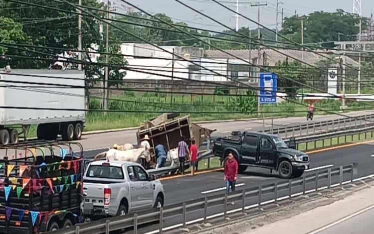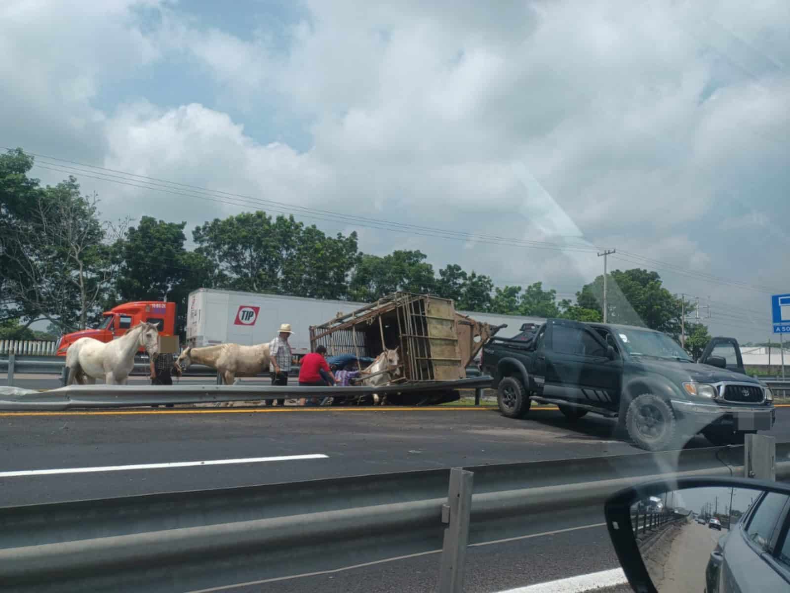 - La mañana de ayer domingo se registró una aparatosa volcadura sobre la carretera Cárdenas–Coatzacoalcos, a la altura del kilómetro 120+800, lo que ocasionó el cierre temporal de la vía y generó un intenso caos vial. El incidente involucró una camioneta que jalaba un remolque con varios caballos, los cuales escaparon tras el accidente.