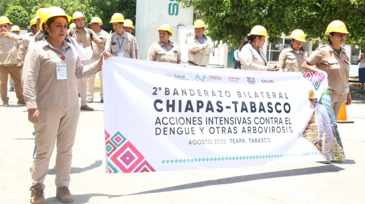 Los secretarios de Salud de Tabasco, Alejandro Calderón Alipi, y de Chiapas, Omar Gómez Cruz, encabezaron el Segundo Banderazo Bilateral de Acciones Intensivas contra el Dengue y otras Arbovirosis en Teapa, Tabasco.