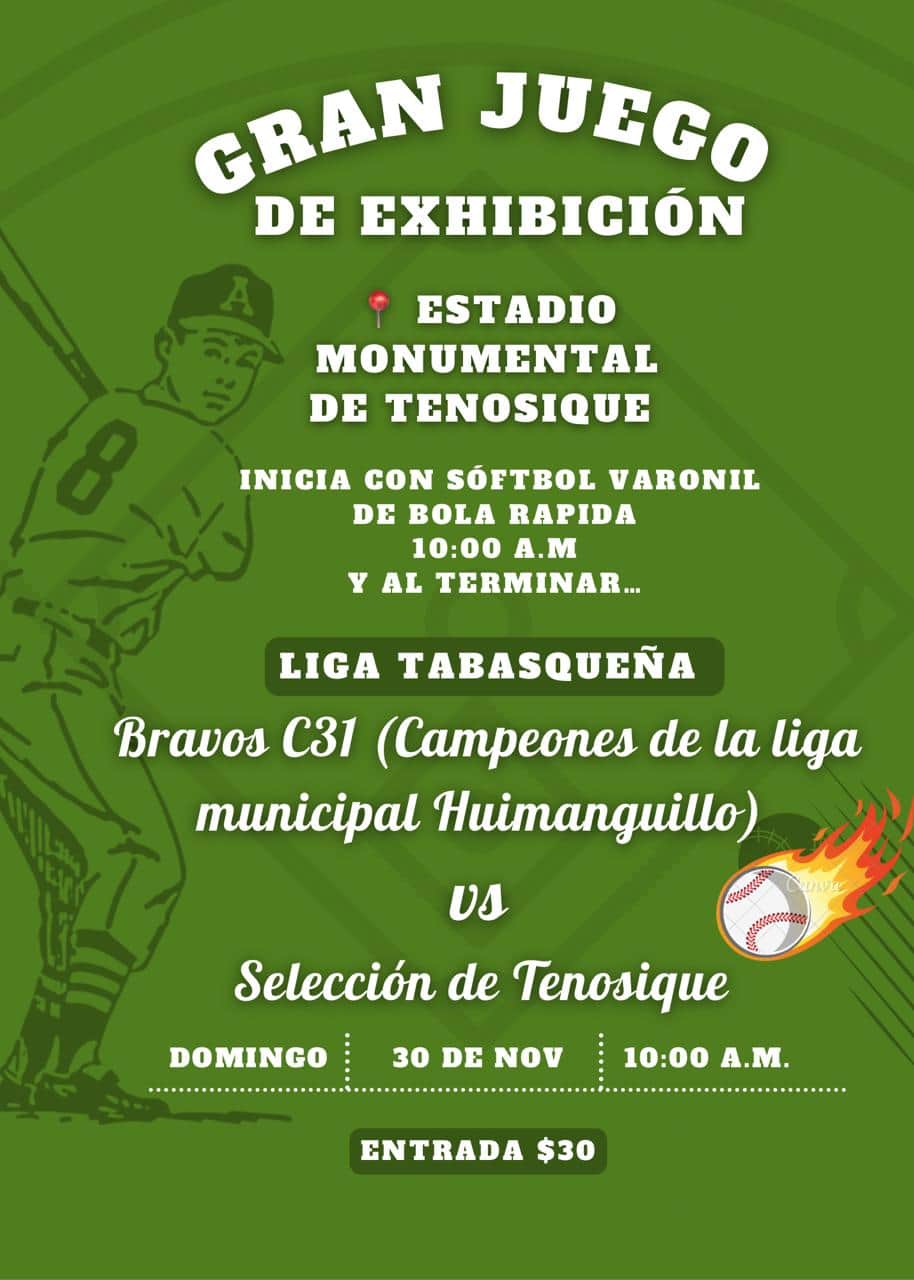 - Un estupendo juego de beisbol se vivirá en Tenosique este próximo 30 de noviembre.