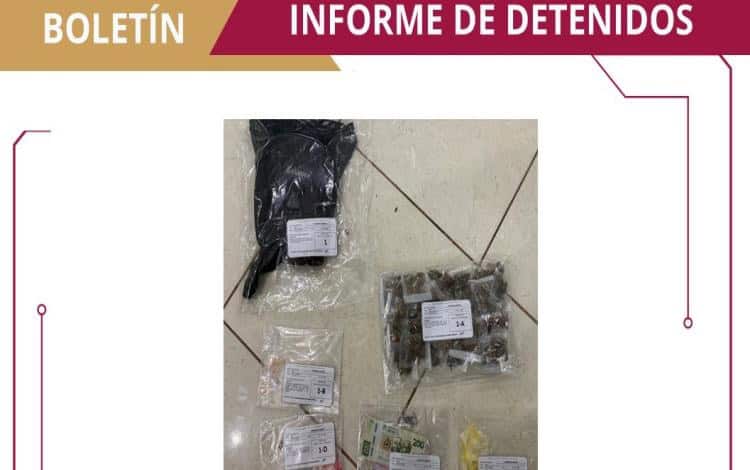 Además de bolsitas que en su interior contenían una sustancia sólida color transparente con características similares a la metanfetamina "cristal" y bolsitas que en su interior contienen una sustancia sólida de color naranja con características similares a la cocaína, una mochila táctica color negro con la leyenda "KAMPAK" y dinero en efectivo.