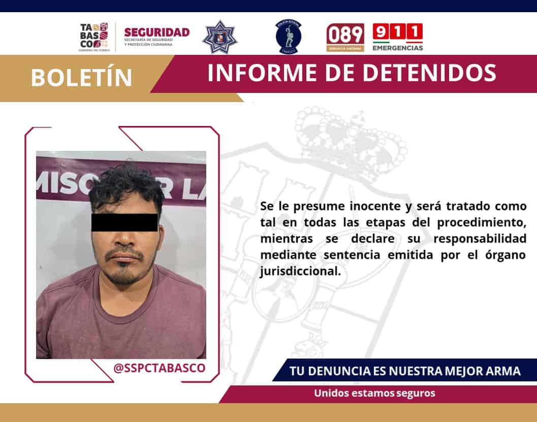 En la calle Juventud de la colonia Delicias, del municipio de Centro, fue detenido Guillermo "N" de 38 años.