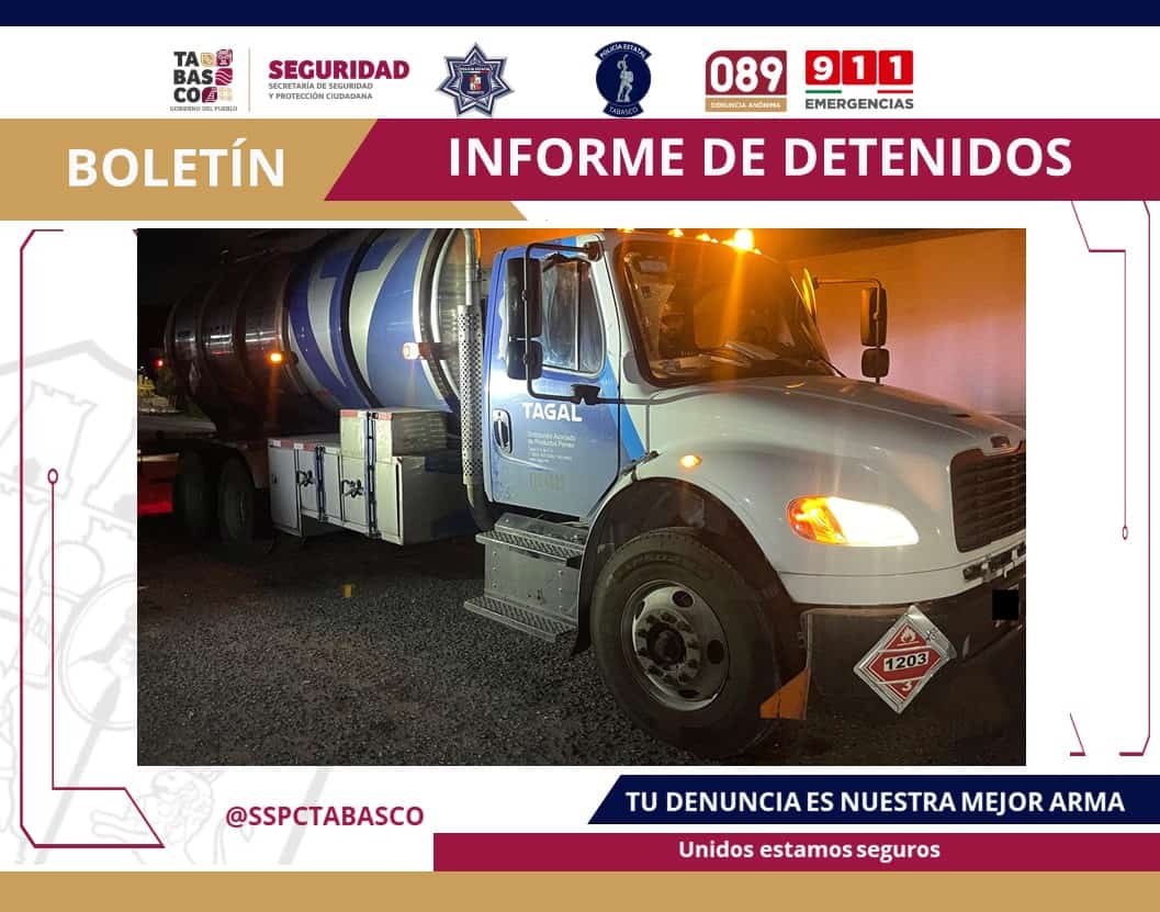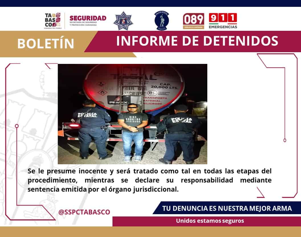 La Secretaría de Seguridad y Protección Ciudadana (SSPC) de Tabasco, en coordinación con la Fuerza Interinstitucional de Reacción Táctica (FIRT) Olmeca, detuvo a un masculino como presunto responsable del delito contra la Ley Federal para Prevenir y Sancionar los Delitos Cometidos en Materia de Hidrocarburo.