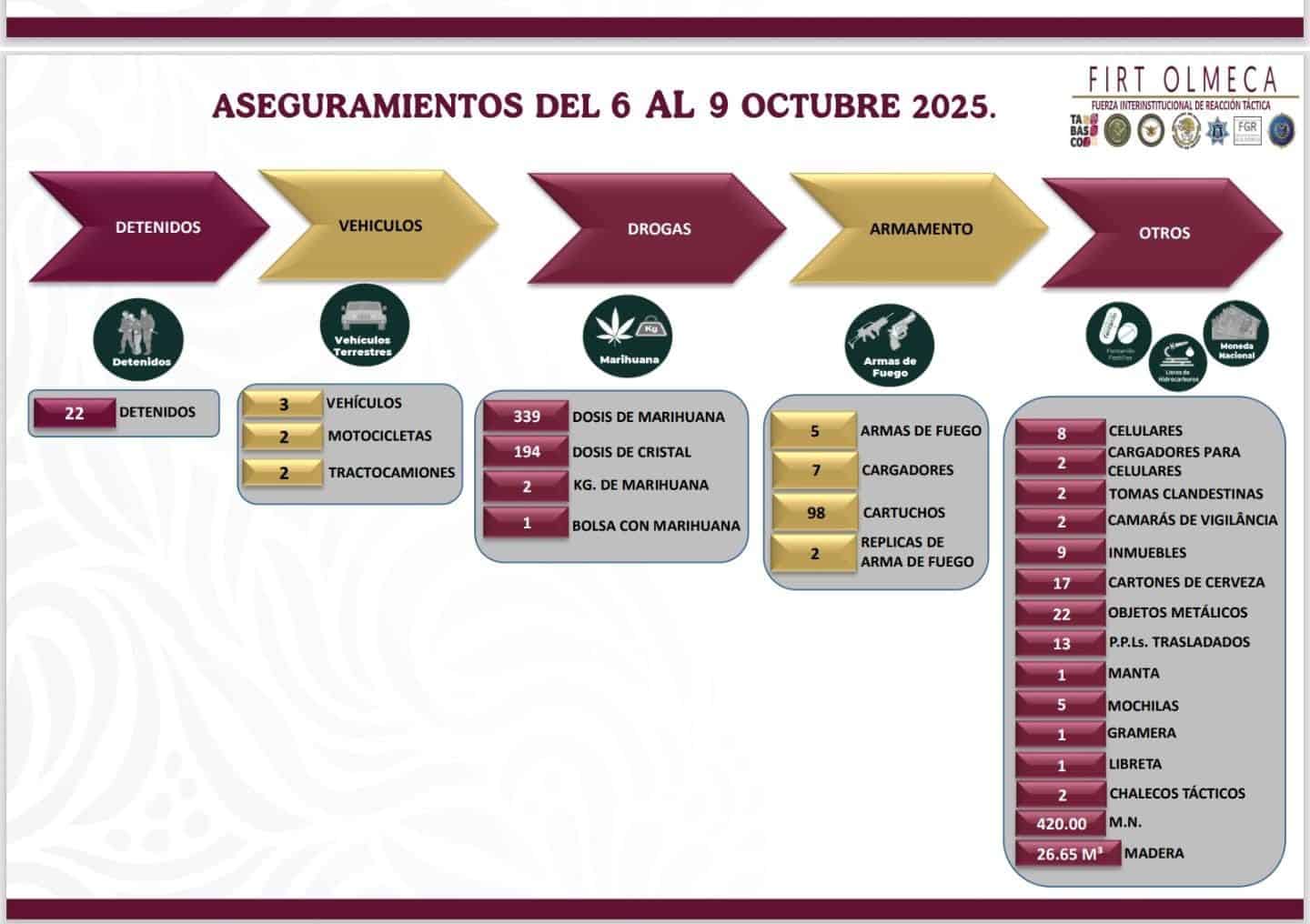 - El Gobierno del Pueblo, que encabeza Javier May Rodríguez, continúa brindando resultados efectivos contra la inseguridad, el combate a la extorsión y al comercio ilegal de estupefacientes, en beneficio de la paz y tranquilidad de la población, por lo que, durante operativos realizados entre el 6 y el 9 de octubre, la Fuerza Interinstitucional de Reacción Táctica (FIRT) Olmeca logró la detención de 22 personas relacionadas con diversos delitos en Tabasco.