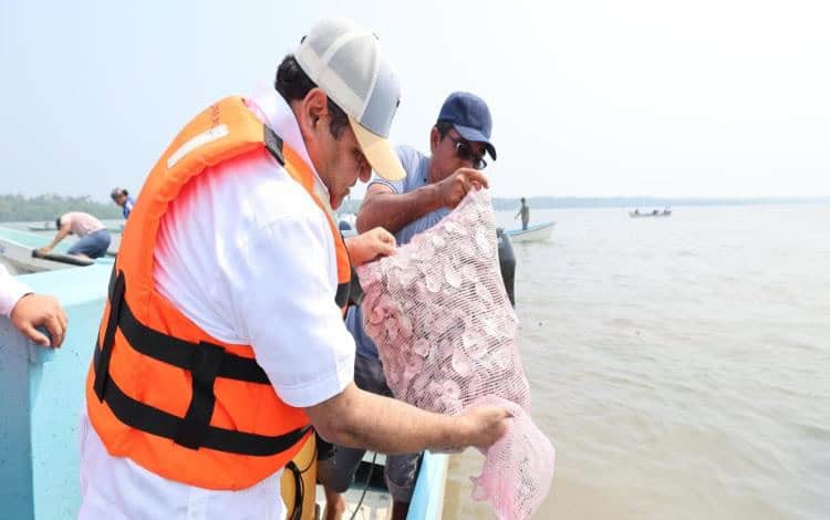 Al final el acto protocolario de entrega de tarjetas, el jefe del Poder Ejecutivo se embarcó en lancha hacia el Interior de la Laguna del Carmen, donde repobló los bancos con concha de ostión, para aprovechar la veda vigente en el proceso de reproducción del molusco.