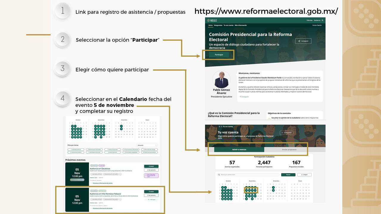 Indicó que las personas y organizaciones interesadas podrán participar de manera virtual a través del micrositio reformaelectoral.gob.mx, donde a partir de unos sencillos pasos lograrán su registro. "No hay proyecto predeterminado, estamos escuchando a todas y todos, esa es la instrucción de la Presidenta Claudia Sheinbaum", enfatizó.