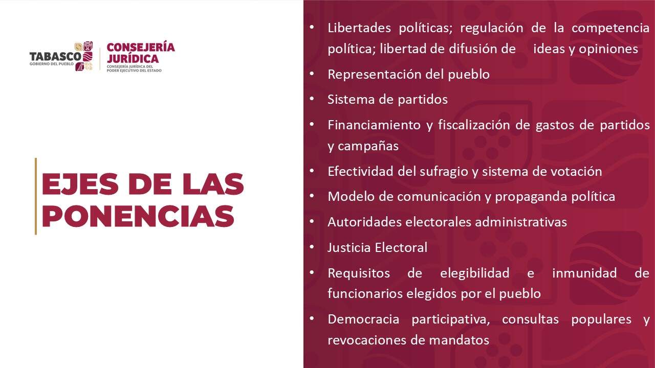 - Indicó que la Audiencia Pública para la Reforma Electoral tiene como base 10 ejes temáticos que son: Las libertades políticas; regulación de la competencia política, libertad de difusión de ideas y de opiniones; Representación del pueblo; El sistema de partidos; Financiamiento y fiscalización de gastos de partidos y campañas; Efectividad del sufragio y sistema de votación.