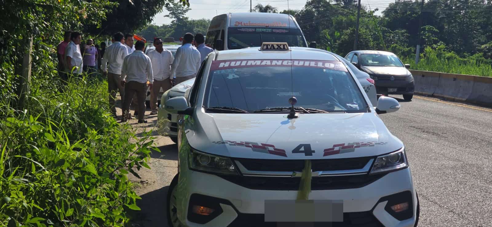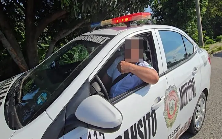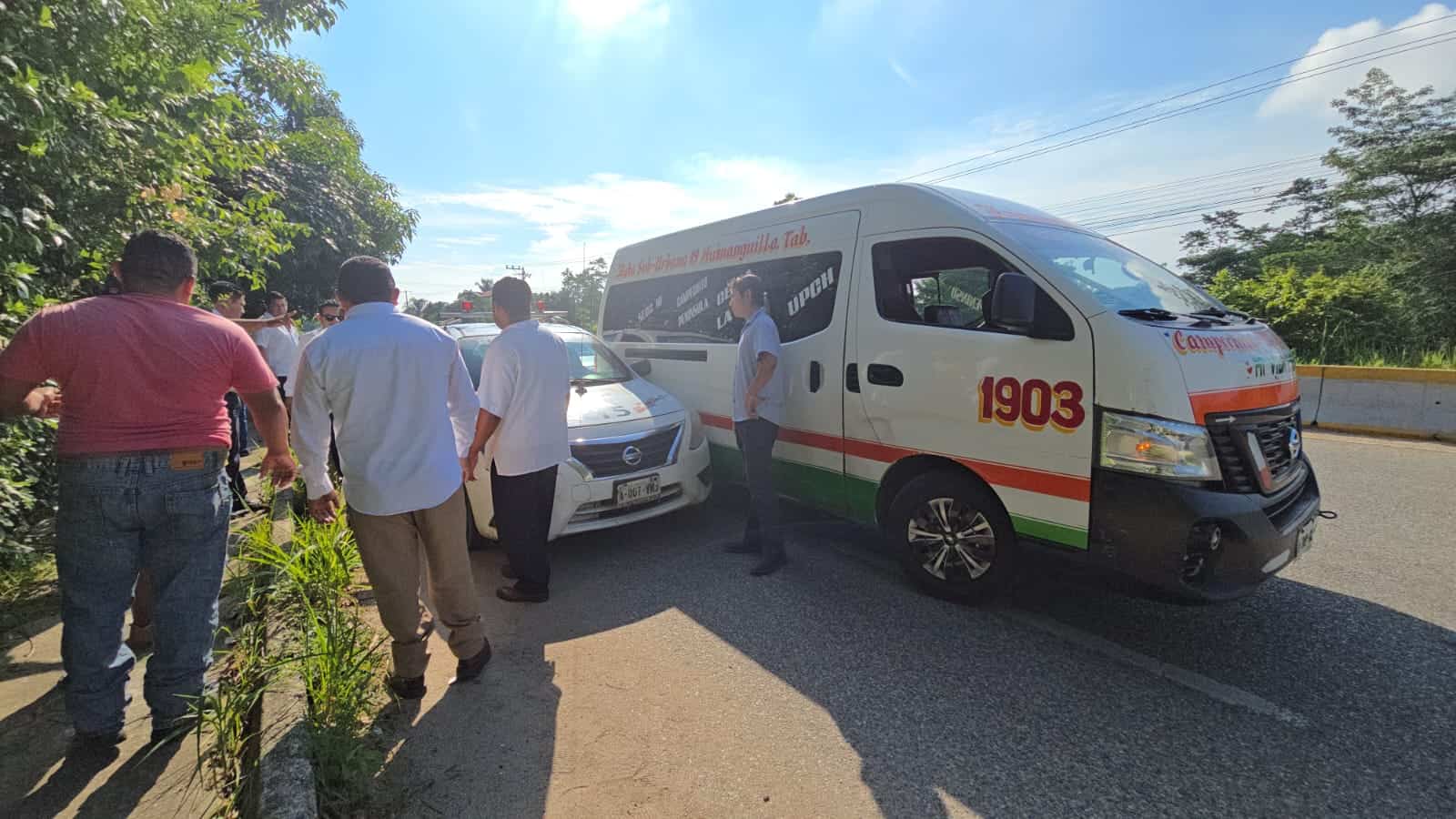 Con palabras obscenas, gritos y amenazas se dirigió un agente de Tránsito que arribó a bordo de la patrulla 115 de la ciudad de Huimanguillo, cerca de la comunidad El Desecho, sobre la vía federal mencionada, donde una unidad conocida como combi choca con un taxi.