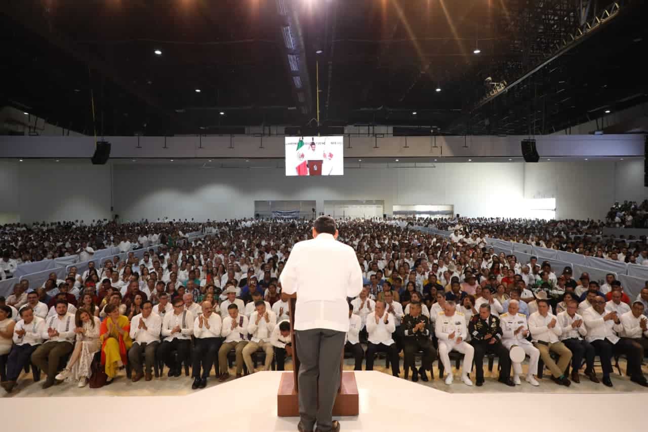 - Ante unos cinco mil tabasqueños y tabasqueñas que abarrotaron el Centro de Convenciones de Villahermosa, en su mayoría, beneficiarios de los programas sociales y productivos que impulsa el Gobierno del Pueblo, adelantó que el año próximo también se dará otra imagen a las principales instalaciones deportivas, con la remodelación del Palacio de los Deportes y el Patinódromo de Olimpia XXI.
