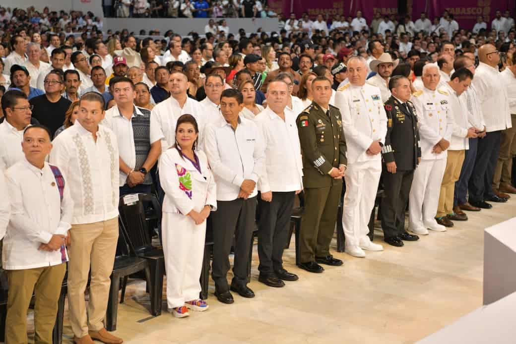 - Ante el representante de la Presidenta de México, Vidal Llerenas Morales, subsecretario de Industria y Comercio de la Secretaría de Economía; la jefa de Gobierno de la Ciudad de México, Clara Brugada Molina, y los gobernadores de Chiapas, Eduardo Ramírez Aguilar y Oaxaca, Salomón Jara Cruz, May Rodríguez dejó claro que el proyecto transformador de Tabasco continuará avanzando sin torcer el rumbo, sin caer en las frivolidades del poder, sin extraviar los principios, y sin descuidar al pueblo, que es nuestro origen y nuestro destino.