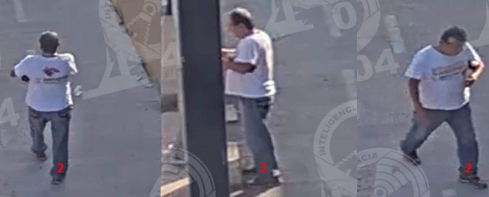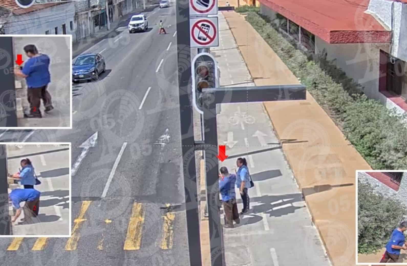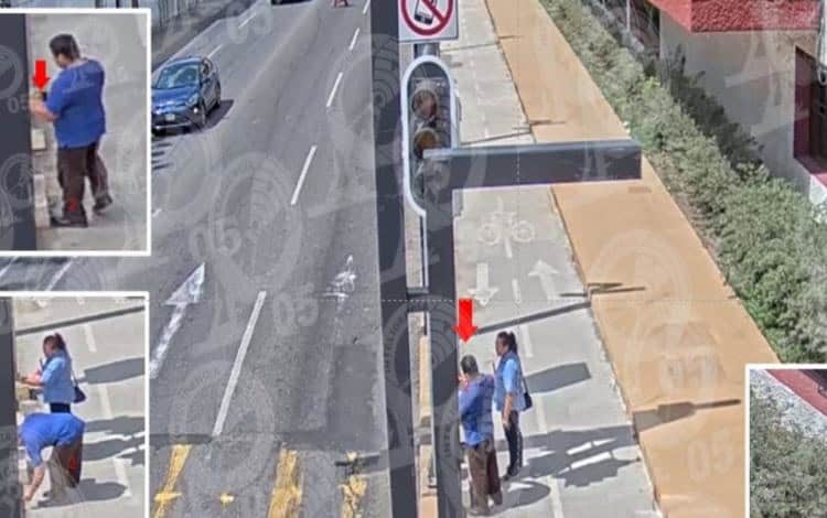 En otra ocasión las cámaras de videovigilancia captaron a un masculino de vestimenta playera color azul, pantalón color café y a una femenina de vestimenta blusa color azul, pantalón negro y bolso negro, en donde se observó al sujeto quien llevaba un objeto en su mano derecha, con el que al parecer manipuló el botón para el paso peatonal, seguidamente recogió algo del piso y volvió a manipular el botón, posteriormente caminó en dirección a la Casa de Artes ‘José Gorostiza’.