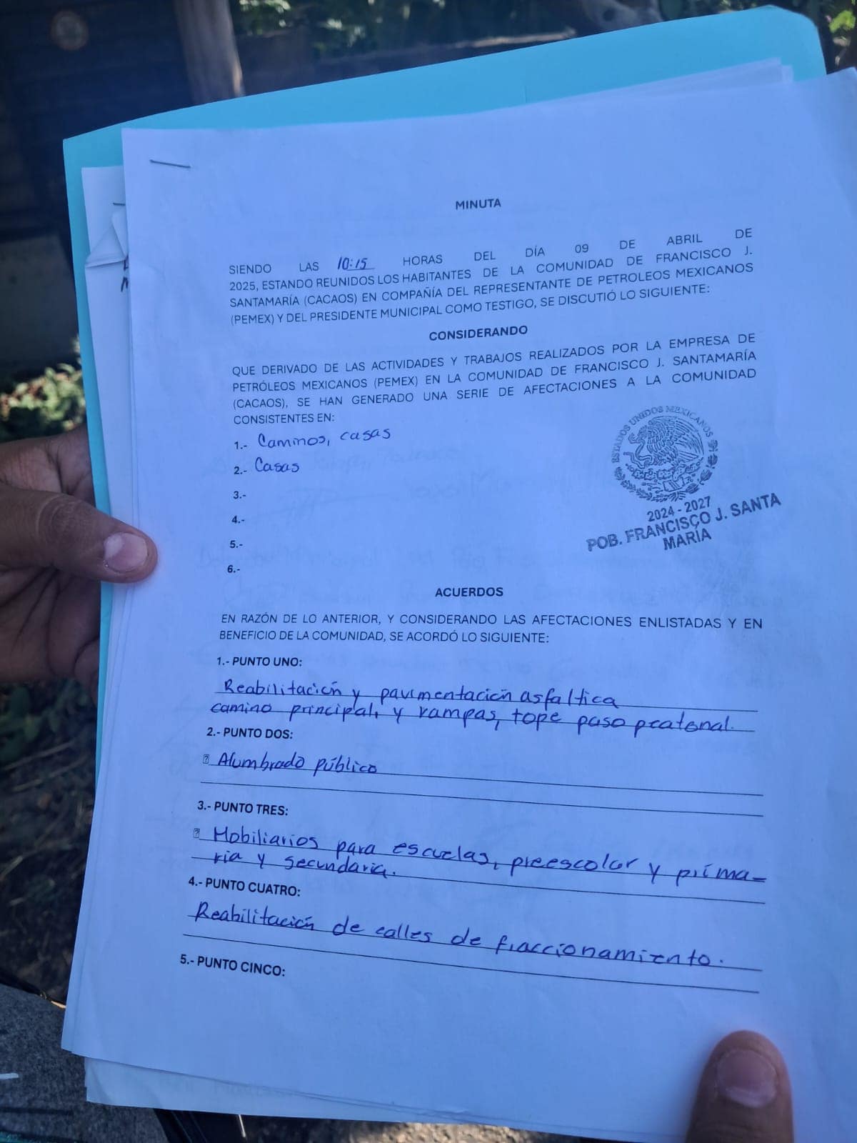 Los vecinos cerraron la circulación con troncos y llantas, encabezados por la delegada Guadalupe Domínguez Potenciano, y pedían la intervención de las autoridades e ingenieros del pozo petrolero, Aseguraban que desde el 10 de abril habrían firmado una minuta con la empresa en donde solicitaron una desviación para los vehículos de las empresas.