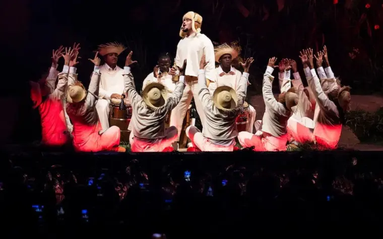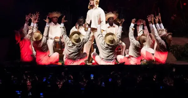 Durante el espectáculo, fusionó géneros como bomba, plena, salsa, trap y reguetón, con una puesta en escena vibrante que incluyó bailarines con sombreros típicos y ritmos afrocaribeños.