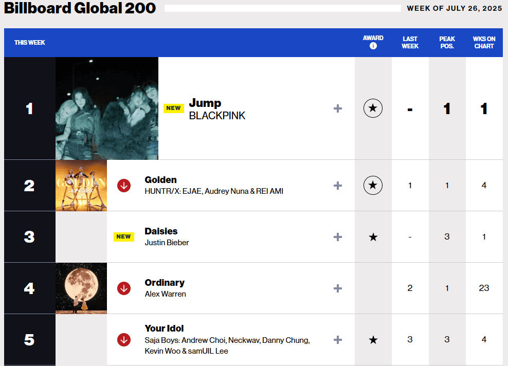 - El regreso de BLACKPINK a la cima de las listas globales ha sido contundente. Su nuevo tema, Jump, debuta directamente en el puesto número 1 tanto del Billboard Global 200 como del Global Excl. U.S., marcando el tercer liderazgo del grupo en la primera lista y el cuarto en la segunda.