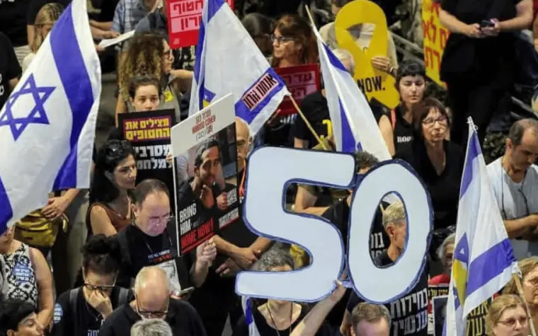 Manifestantes en Tel Aviv presionan al gobierno de Netanyahu para alcanzar un acuerdo que ponga fin al cautiverio de 50 personas retenidas por milicias palestinas.