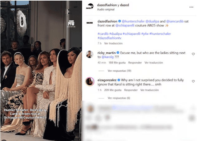 Ricky Martin y Eiza González defienden a Karol G tras ser ignorada en desfile de moda.