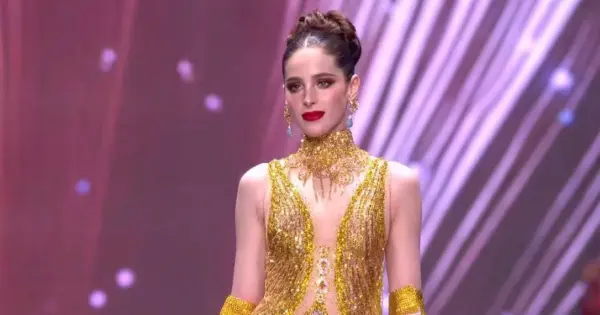 Fátima también sorprendió con un traje nacional inspirado en Xochiquétzal, diosa mexica de la belleza, la fertilidad y las flores. El diseñador Fernando Ortiz explicó que la intención fue fusionar espiritualidad y cultura mexicana en una pieza que celebrara lo bello.