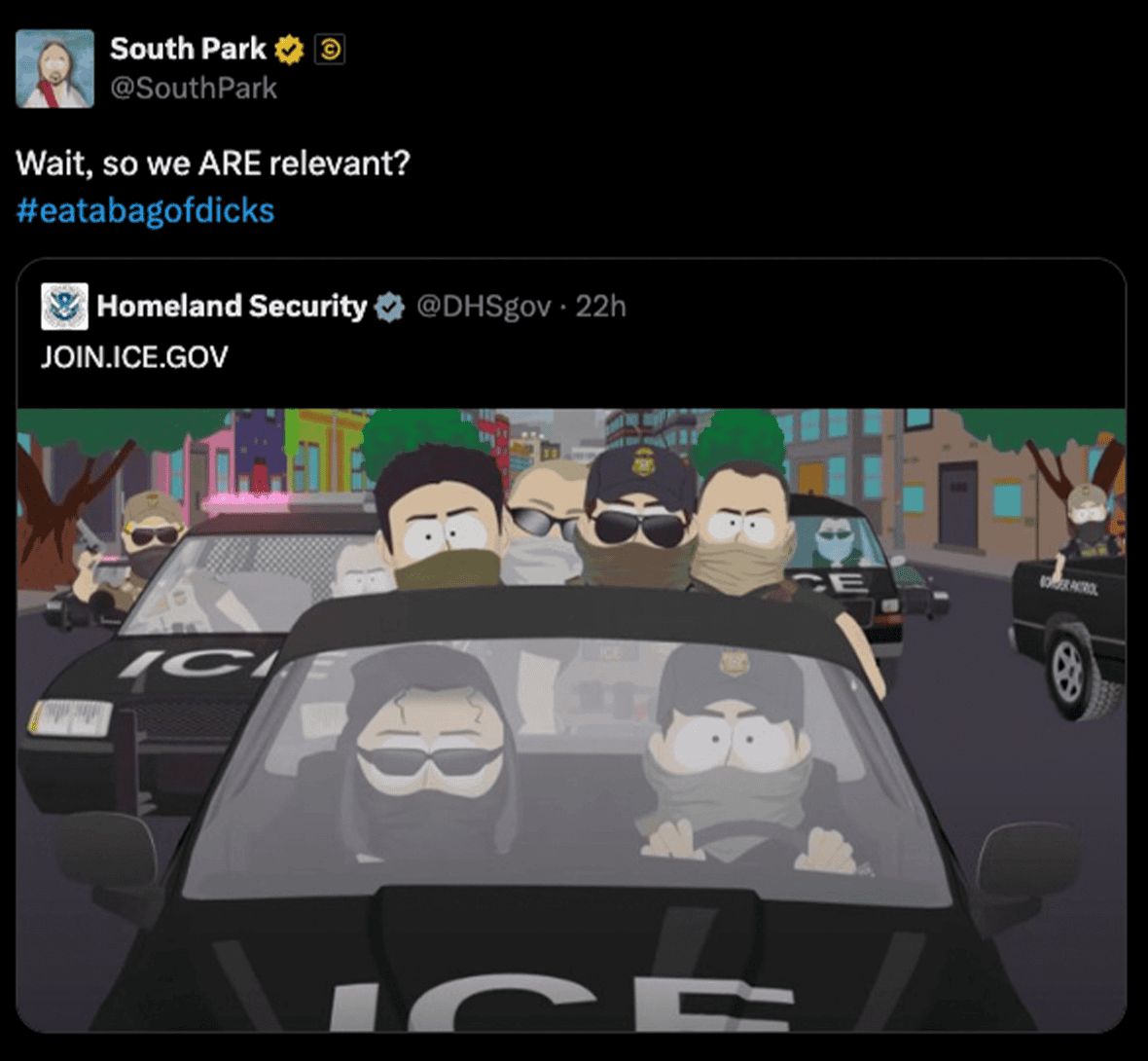 - ICE, tras la emisión, usó una imagen del episodio en X para buscar nuevos reclutas. La cuenta oficial de la serie respondió con ironía: